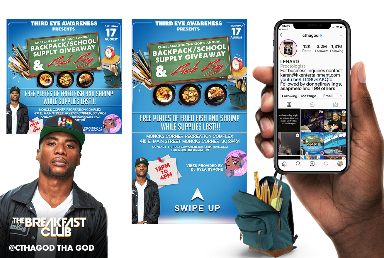 Social promotional design for The Breakfast Club's Charlamagne tha God’s Annual backpack and school supply giveaway.